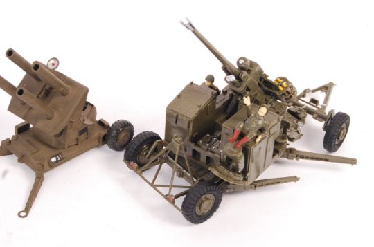 A collection of five 1/35 scale Japanese made plastic military models comprising a Tamiya  armoured vehicle, Nitto battery operated vehicle, Imai Kagaku Co Ltd artillery gun, Renwal anti aircraft gun and another scale armoured vehicles. All appearing mostly complete however some minor details may be missing. Highly Detailed models. Measures 23cm long (largest).