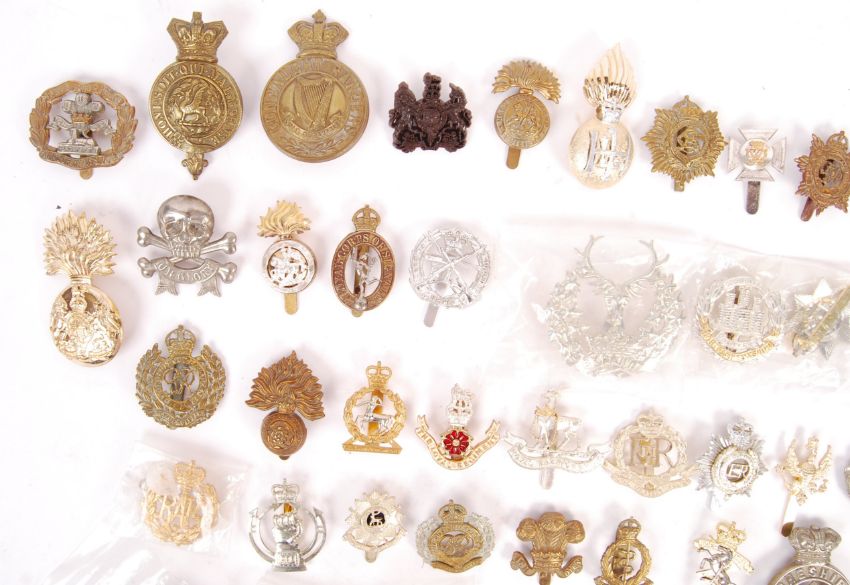 A good collection of approx x100 assorted British Army military uniform cap badges - various eras and conflicts represented, to include badges for: Royal Army Service Corps, Royal Marines, Connaught Rangers, Durham Light Infantry, Royal Berkshire, Royal Army Veterinary Corps, Royal Engineers, South Staffordshire Regiment, North Stafford, REME, RAF, The King's Own Regiment, The Norfolk Regiment, Lancashire Fusiliers, Tank Corps and many others. Large and interesting collection. Note: from an incredible large private collection of military cap badges - the majority of which are genuine period examples. Some restrikes and replicas will be present, and buyers are reminded to satisfy themselves as to individual lots prior to bidding, irrespective of description.