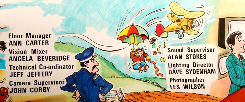 An incredibly rare unique ' That's Life! ' BBC Television credits scroll. The scroll featuring hand painted artwork by Rod Jordon. The artwork features various topical scenes (or scenes that related specifically to that episode interspersed with printed credits and official information. For this episode, the credits are billed thus: ' With Esther Were: Bill Buckley, Gavin Campbell, Michael Groth and Maev Alexander, John Gould, Doc Cox ' and then lists the crew and other executives.Shows were typically shot just a few hours before being screened, so to keep the credits topical and relevant, each show had a unique credit scroll painted just hours before production by Jordon. Cartoon in style, this scroll features various vignettes - a seaside scene, an interview scene, aeroplane scene, ' Certificate Of Airworthyness ' scene, and a sheep jumping scene. A unique and important part of British television history. Measures approx; 15ft long total length, artwork approx 12ft.Provenance: obtained by the vendor when they worked on production.That's Life! was a magazine-style television series on BBC1 between 26 May 1973 and 19 June 1994, presented by Esther Rantzen throughout the entire run, with various changes of co-presenters. The show was notable for presenting hard-hitting investigations alongside satire and occasional light entertainment. The show was generally recorded about an hour prior to transmission, which was originally on Saturday nights and then on Sunday nights.