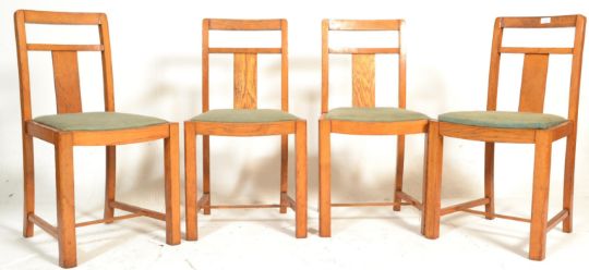 A set of four 20th Century Art Deco oak splat back dining chairs, drop in seat pads raised on square supports united by stretchers. Measures 58cm high by 46cm wide by 43cm deep.