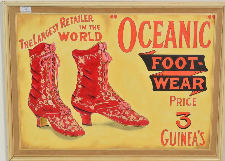 A contemporary oil on board artists impression of a vintage enamelled advertising sign for Oceanic Foot Wear 'The Largest Retailer in the World', painted with a pair of red lace up Victorian boots. Framed. Measures 60cm high by 80cm deep.