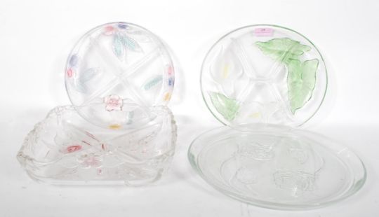 A group of four vintage retro mid 20th Century hor d'oeuvres sectional centrepiece plates to include a French ovular plate having pressed decoration of lilies together with three others; a round plate with pressed chestnut tree decoration, a blossom design plate and a rose design plate.