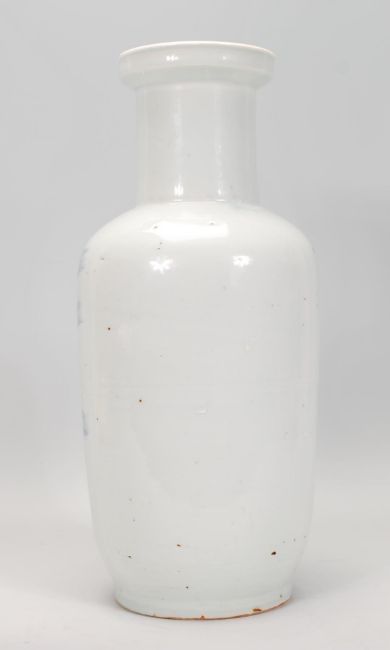 A 19th Century Chinese vase of baluster form hand painted in blue and white with a mountainous landscape with a traveller within it. AF. Measures 35cm tall.