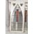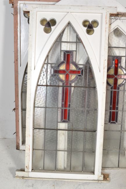 A group of seven early 20th Century ecclesiastical lead lined stain glass church windows of arched form set within white painted frames. Textured and frosted glass panels with red stain glass forming religious crosses. some windows A/F. Average sizes measures 169cm tall by 85cm wide.