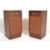 A pair of 1960's retro vintage Meredew teak wood bedside cabinets, each having a single drawer above a shelved cupboard, all raised on a plinth base. The drawer having a brass drop handles and the cupboard with brass loop handle. Applied label to door. Measures 66cm high by 32cm wide by 31cm deep.