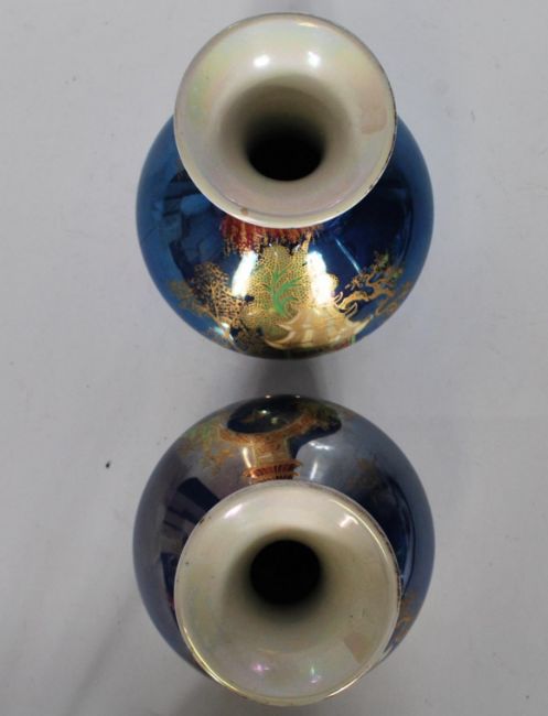 A matching pair of early 20th Century Carlton Ware blue lustre glaze vases, with gilded Japanese design, circa 1920s, pattern no. 2814. Measures 17cm tall and 10.5cm in diameter.