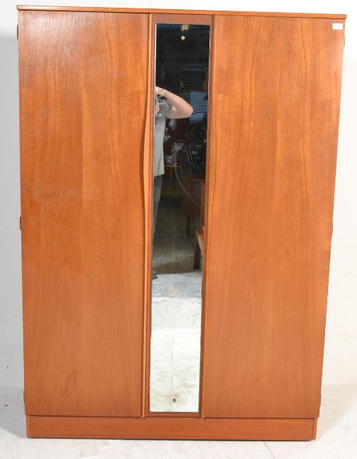 A retro 20th Century teak wood Austin Suite bedroom suite comprising of a chest of drawers, double wardrobe with central mirror panel flanked by full length doors and a bedside cabinet. Measures 171cm high by 122cm wide by 57cm deep.