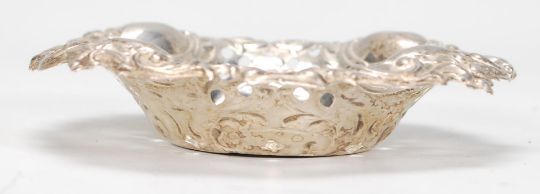 A silver pin dish of round form having rococo repousse and pierced decoration having a flared rim. Unmarked. Weight 24.0g. Measures 10cm diameter.