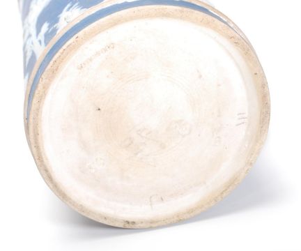 A 19th Century Victorian jasperware tea pot having a cobalt ground with raised white classical figures together with a a similar Wedgwood jug having grape vine decoration to the rim and a milk glass jar of squat form having gilt decoration with raised floral sprays and scrolled detailing.