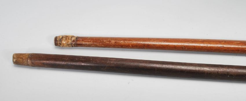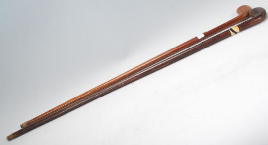 Two early 20th Century Sunday / Sabbath walking stick canes design with knob handles which can also double as the head of golf club, one having a bone inlaid shaft, the other of tapering form.