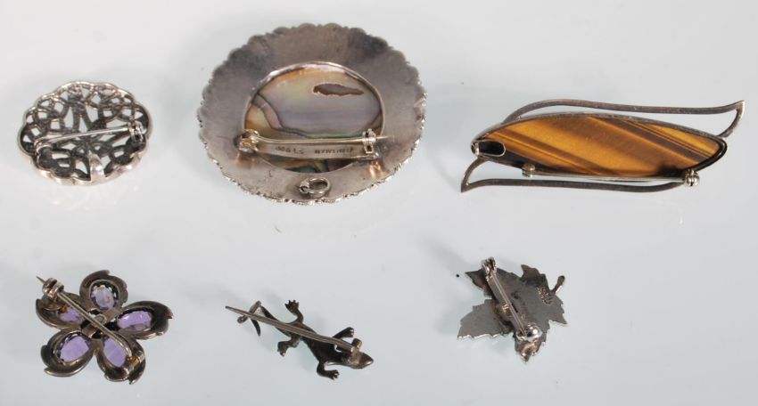 A selection of silver brooches to include a tigers eye brooch in a pierced decoration setting, a round celtic knot brooch, an enamelled leaf brooch, a small brooch in the form of a lizard, a flower brooch set with oval cut purple stones and seed pearls, and a large brooch of round form set with a round mother of pearl panel with filigree decoration mount. Gross weight 49.4g.