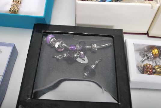 A collection of ladies dress costume and silver jewellery to include a gold plated silver 925 ring set with a cabochon ammolite stone, ladies dress wristwatch, pendant silver gemstone necklace, gold plated brooch modelled as a seal encrusted with white stones balancing an emerald, friendship bracelet, three Padua bracelets in the manner of Pandora, bracelet in the manner of Links Of London and a tigers eye beaded necklace with a silver 925 clasp. All jewellery new and unused in boxes.
