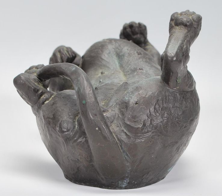 A 20th Century Doris Linder Heredities bronzed composite figurine of a Dachshund modelled on its back. Makers sticker to base.