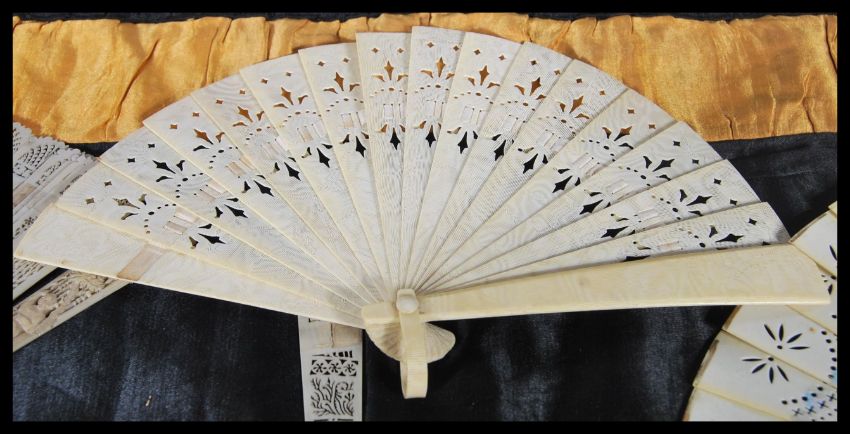 A group of Vintage early and later 20th Century hand fans, to include a bone fret pierced fan with purple feathers and hand painted decraition, a heavily carved 19th Century Ivory fan having twenty eight panels ( one broken). A large black Venetian style fan, having a painted scenes and two others with fret pierced decortin, one being hand painted and a vintage silk runner.