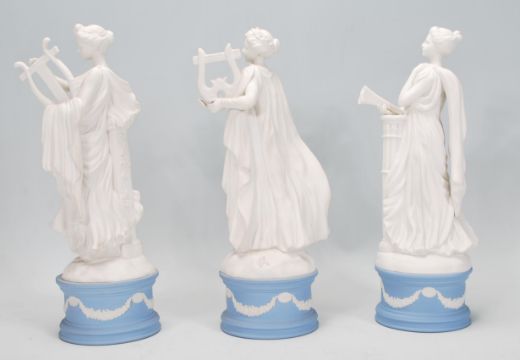 A full set of nine Wedgwood Jasperware figures modelled as The Classical Muses each raised on a circular plinth adorned with sprigged festoons. To include among others Polymnia 667, Calliope 1,280, Urania 473, Thalia 408 (af) Melpomene 113, Grato 2,050 and Terpschore (7).