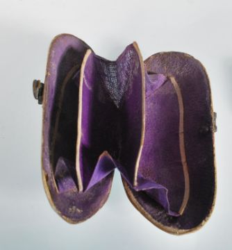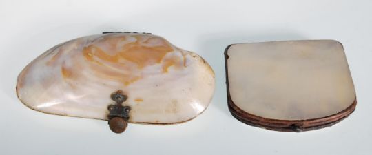 A 19th Century shell purse having brass hinge and clasp with purple lined interior. Together with an early 20th Century ladies purse having mother of pearl paneling to both sides with the front having applied silver decoration. Biggest measures 11cm wide.