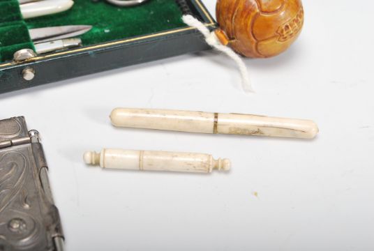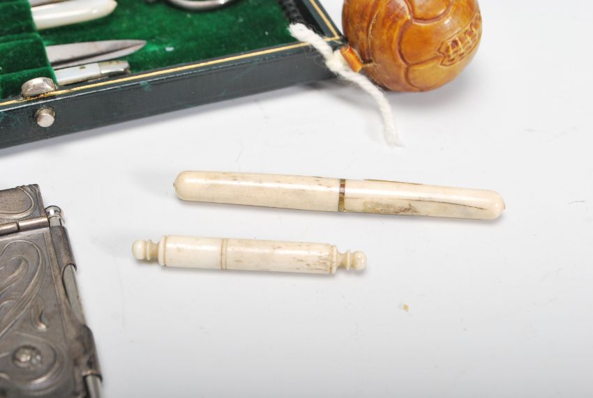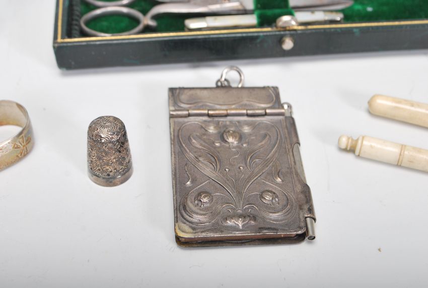 A collection of sewing items to include an early 20th Century leather cased sewing kit, a tape measure modelled as a roller skate, tape measure modelled as a football, silver hallmarked thimble, an Art Deco sewing kit modelled as an amphora, bone needle cases, together with an Aide Memoir and a pair of silver hallmarked sugar tongs.