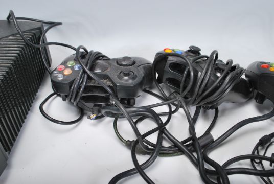 An original Xbox games console together with with three Xbox controllers, cables and The Sims.
