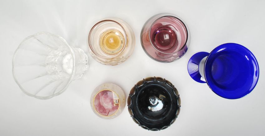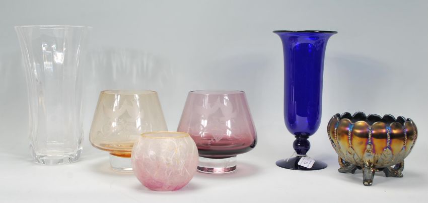 A small group of mixed glassware to include an early 20th Century heavy crystal glass vases, two Caithness vase with both retaining original stickers, Bristol Blue vase having a flared rim raised on a circular base, Carnival glass bowl etc. Tallest measures 24cm tall.