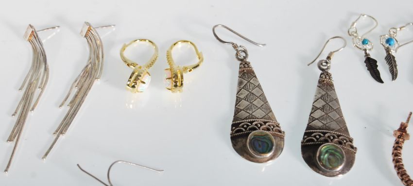 A large quantity  of silver earrings to include a pair of hallmarked vermeil hoop earrings, a pair of kingfisher earrings, a pair of feather design earrings set with turquoise, a pair of diamond shaped earrings set with mother of pearl, a pair of drop earrings with geometric engraving set with mother of pearl, a pair of pearl stud earrings etc. Total weight 80.1g.