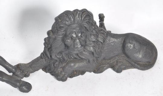 A pair of  cast iron boot scrapers depicting a lion and a unicorn. Front facing relief figures with boot scraper stands to back. Finished in an ebonised black paint. Measures: 42cm x 60cm.