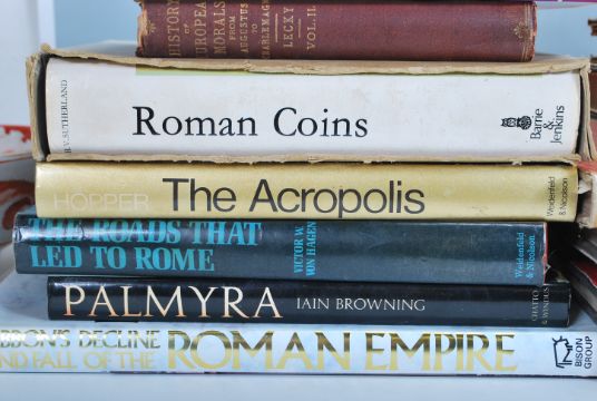 A collection of books on Roman History to include: Gibbons Decline and Fall of the Roman Empire, Palmyra by Iain Browning, The Roads that led to Rome, The Acroplis by the R.J. Hopper, Roman Coins by C.H.V Sutherland, Roman Medicine by John Scarborough, Enemies of the Roman Order by Ramsay Macmullen, Michael Grant by The Roman Forum , Cities of Vesuvius by Michael Grant, Ancient Greek Cons by G.K. Jenkins, Prehistoric Britain from the Air by Timothy Darvill, The Roman Villa in Britiain by A.L.F Rivet, The Roman Imperial Army by Graham Webster, Sparta by H. Mitchell, Roman Brick and Tile by Alan Mcwhirr, Eros in Antiquity, Mosaics by Paul Hamlyn, The Colosseum by Peter Quennell, Gold and Silver Treasures of Ancient Italy by Carlo Carducci, Song of a Falling World by Jack Lindsay, The Oracles of Zeus by H.W. Parke, History of European Morals, Roman Imperial Navy by C. G. Starr & The Buildings of Roman Britain by Guy De La Bedoyere.