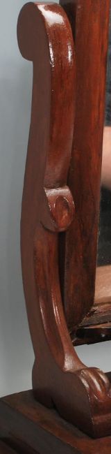 A large 19th century Victorian toilet swing mirror being raised on a serpentine base with large mirror supported with scrolled supports.  Measures 65cm high by 52cm wide.