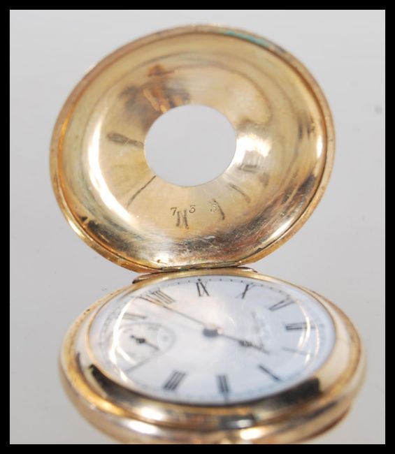 A late Victorian gold plated half hunter cased fob pocket watch being signed AM Watch Co Mass. Inscribed for 1897. Enamel half hunter face with monogram verso.