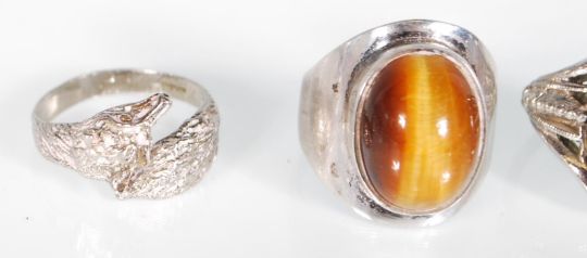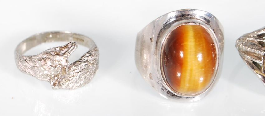A group of three silver rings to include a hallmarked ring set with a large cabochon tigers eye stone, a hallmarked ring designed as a belt and buckle and a 925 stamped ring modelled as a frog, together with a silver white metal ring. Gross weight 20g.