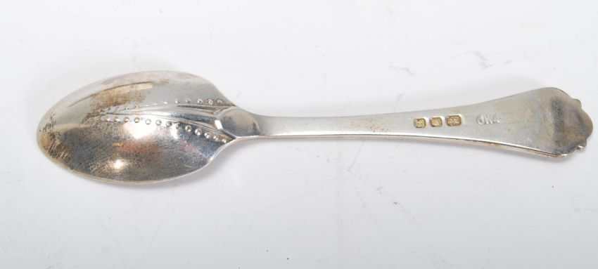 A cased set of of silver hallmarked coffee spoons having shaped handles with rat tail detailing to verso, within fitted leather case. Hallmarked for London date letter D 1939, makers mark for Josiah Williams & Co. Total weight 56.7g. Spoons measure 8.5cm long.