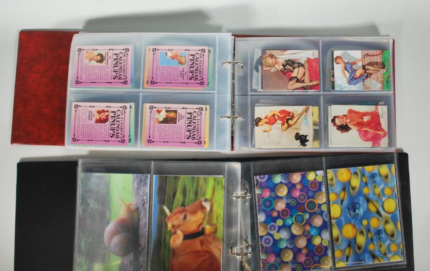 Two albums of trade cards to include Star Trek lenticular postcards ' Women of Star Trek ', Gil Elvgren's calendar pinups cards together with an album of mixed lenticular cards including various subjects including dinosaurs, animals and artworks.