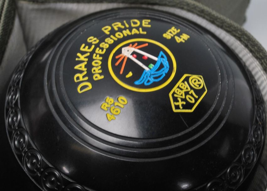 A set of four Drakes Pride professional bowls R5 4610 size 4M complete is green canvas carrier, along with a John Jaques sports bag.