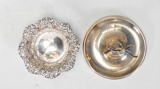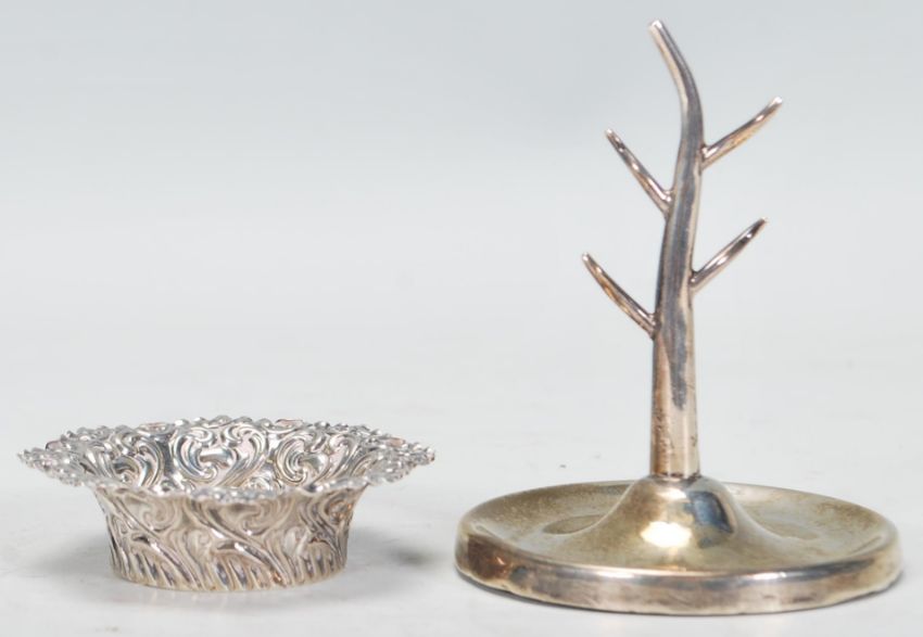 A silver hallmarked William Aitkin ring stand in the form of a tree in a round dish / base (hallmarked Birmingham 1901, filled base) together with a dressing table pot having a flared rim with repousse decoration (hallmarked London 1919 weight 11.0g.).