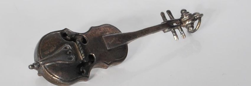 A large hallmarked 925 silver brooch pendant modelled as a stringed musical instrument - violin / double bass. Measures 70mm, width 18mm. Weight 11g.