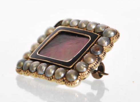A George IV 1824 high carat gold window locket lace pin brooch. Half pearl halo around a gold and ebony border window locket with hair. Inscribed to verso Eliz th Hewes Died Oct 6th 1824 Aged 53. Measures approx 2cms x 1cms. Weight 4.79g