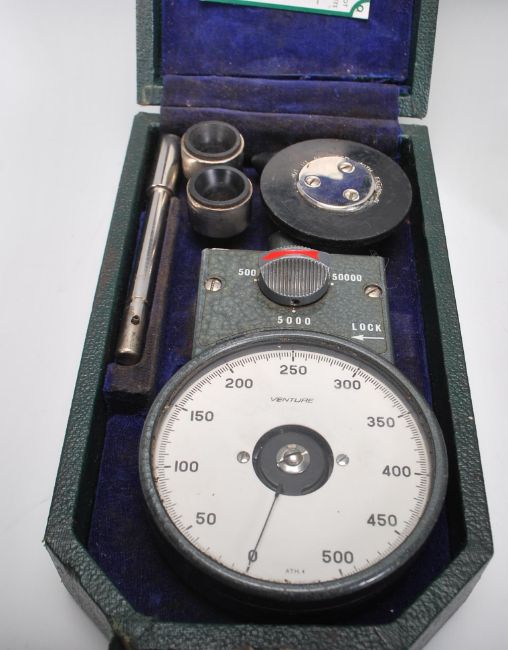 A group of vintage 20th Century gauges / meters to include a dark green bakelite cased Megger Circuit Testing Ohmmeter, Venture tachometer kit in in a fitted leather case, volt amp test meter etc.