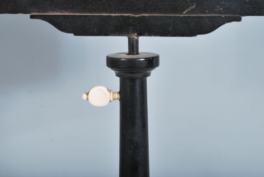 A Victorian 19th century ebonised table top menu holder - pictorial stand. Trefoil base with adjustable height tapering column having postcard / menu sized frame showing an Industrial factory building believed to be in Stuttgart, Germany having handwritten notation to the rear. Measures 39cms high at time of photo online