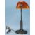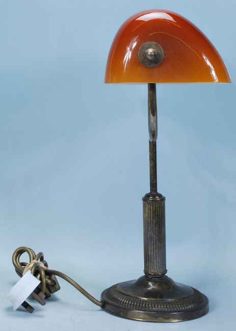 A vintage 20th Century brass bankers lamp having an orange shade with column stem raised on a circular base.