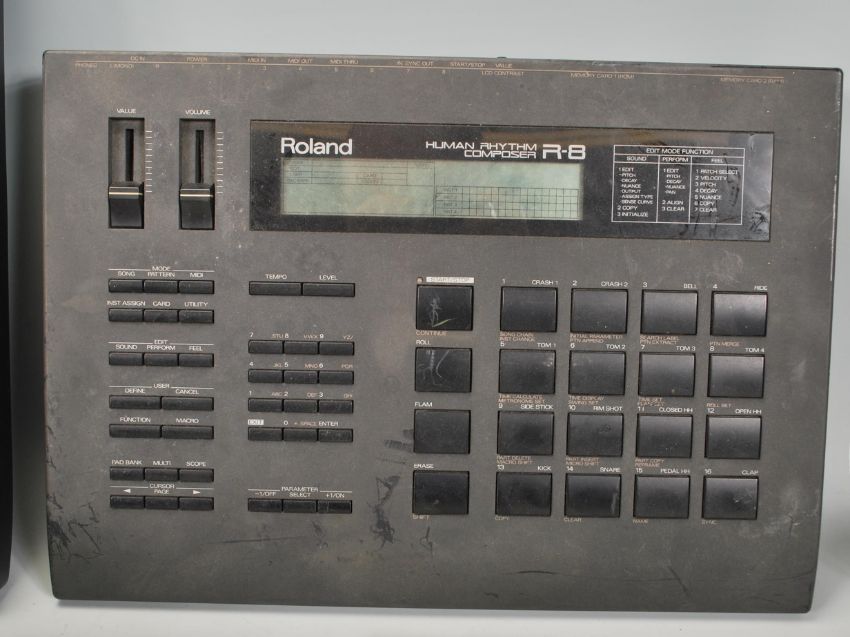 DJ equipment to include a Roland Human Rhythm Composer R-8, a Yamaha MD8 Multitrack MD Recorder and a Rotel stereo cassette deck model RD-20 Dolby System. Biggest measures 48cm wide by 39cm deep.