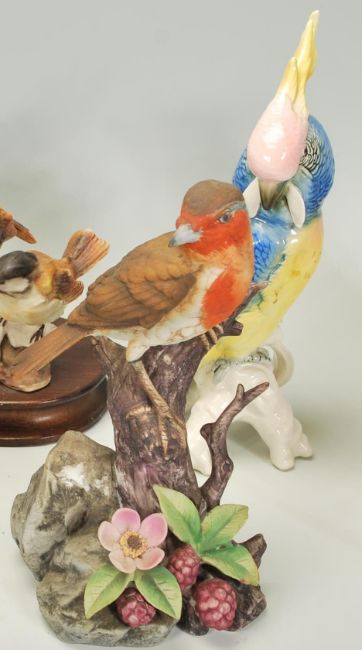 A large collection of Italian ceramic / Capodimonte style bird figurines to include a Viertasca bird group, Kingfisher, crow, sparrow figurine group etc. Some signed.