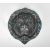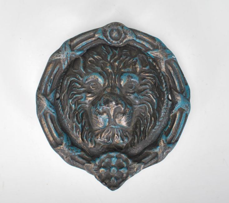 A large statement cast iron lion mask door knocker of round form having embossed lion mask to the back and swing knocker to the front having brushed blue and gold finish.