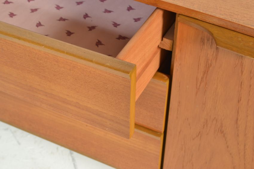 A retro 20th Century teak wood sideboard credenza by Austinsuite, central bank of three drawers flnked by cupboards under flared top raised on tapering supports. Measures 69cm high by 131cm wide by 46cm deep.