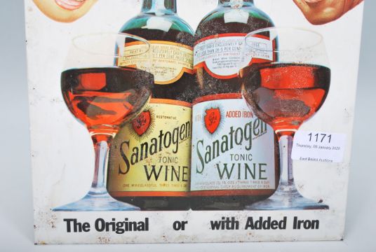 A vintage 1960's Sanatogen tonic wine point of sale advertising sign for 'the original or added iron', free standing with easel back.