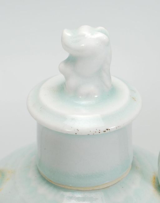 An early 20th Century Chinese teapot of small proportions finished in a light green glaze having scroll and foliate decorated body with shaped handle and spout. Dragon head finial atop. Measures 17cm tall by 13cm wide.