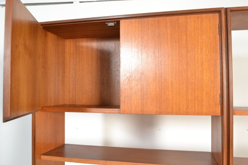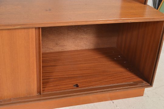 A vintage retro G Plan teak wood red label low side board having sliding inset doors, having two upright shelving units above containing shelves and cabinets, one having a speaker to the top of the unit, together with another teak cased speaker.