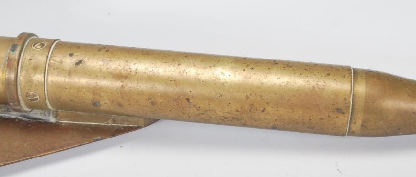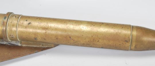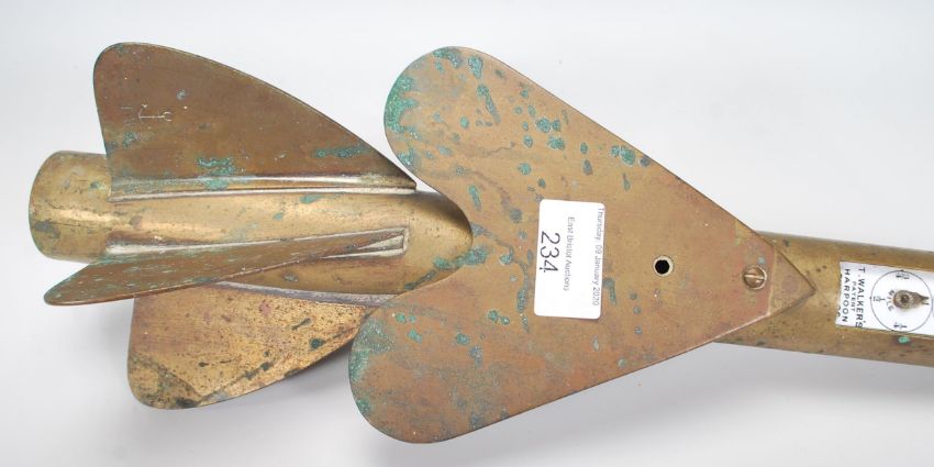 An early 20th Century T Walker's patent brass harpoon ship log of torpedo form having three enamelled dials measuring distance in miles, used for towing behind the ship and measuring distance.  Measures 65cm long.