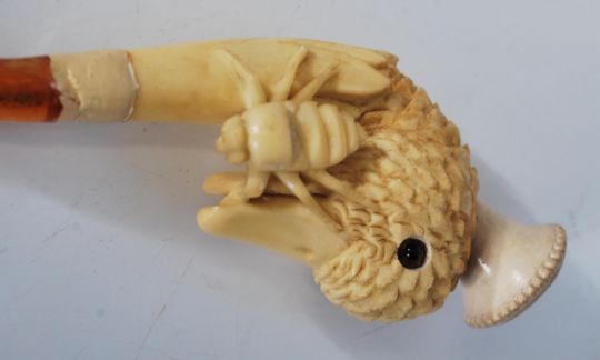 An early 20th Century carved pipe in the from of a ducks head having a small bug on the side with a faux amber mouthpiece. In original fitted leather case. Measures 10.5cm long.