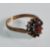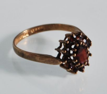 An English hallmarked 9ct yellow gold ladies dress ring having a central claw set oval faceted cut garnet with a further halo of garnets. Hallmarked 375 for London. Ring size P. Gross weight 2.1g.