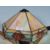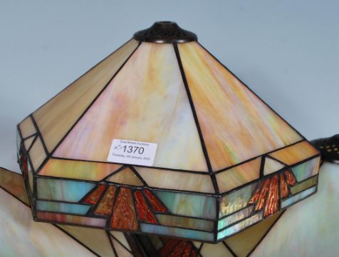 A matching pair of vintage 20th Century Tiffany style leaded glass hanging ceiling light shade of hexagonal form. Art Deco manor with mother of pearl style glass and orange glass detailing. Together with matching lamp shade. Ceiling shades measures 44cm diameter.