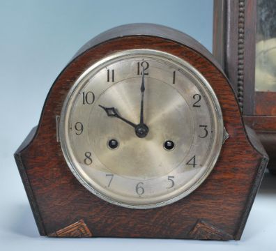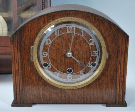 Two early 20th Century oak cased Art Deco mantel clocks the first a Bentima striking on a Westminster chime, the other fitted with a Comet movement striking on a gong together with an oak cased wall clock of the same period.